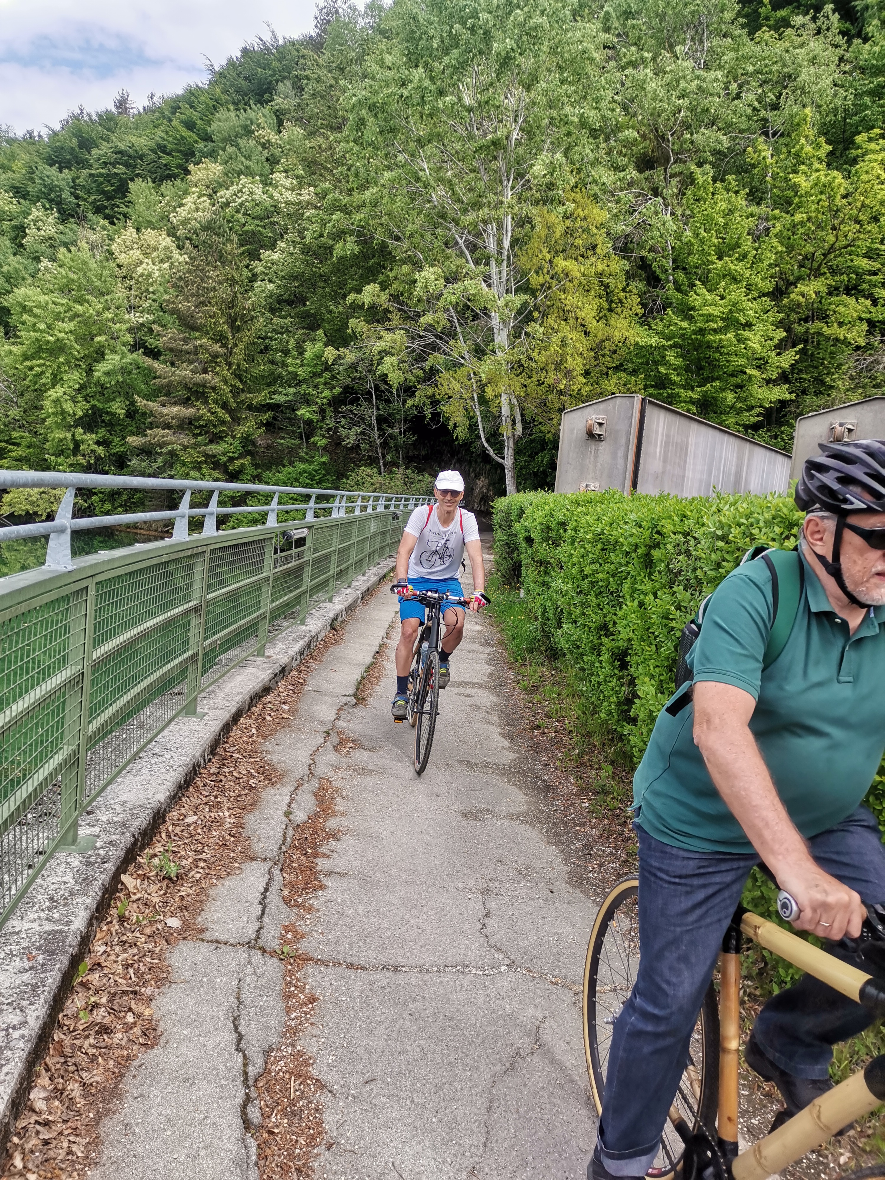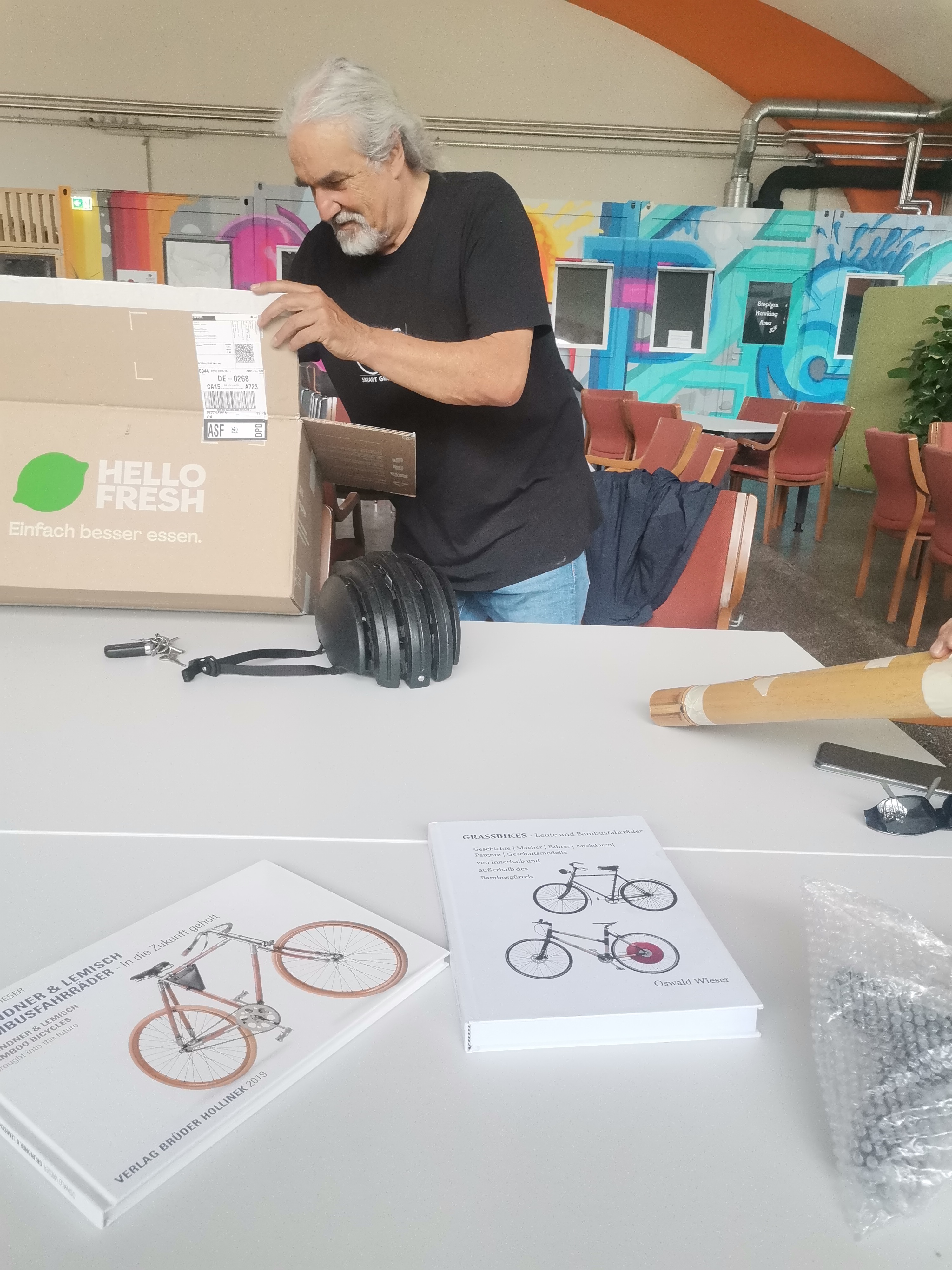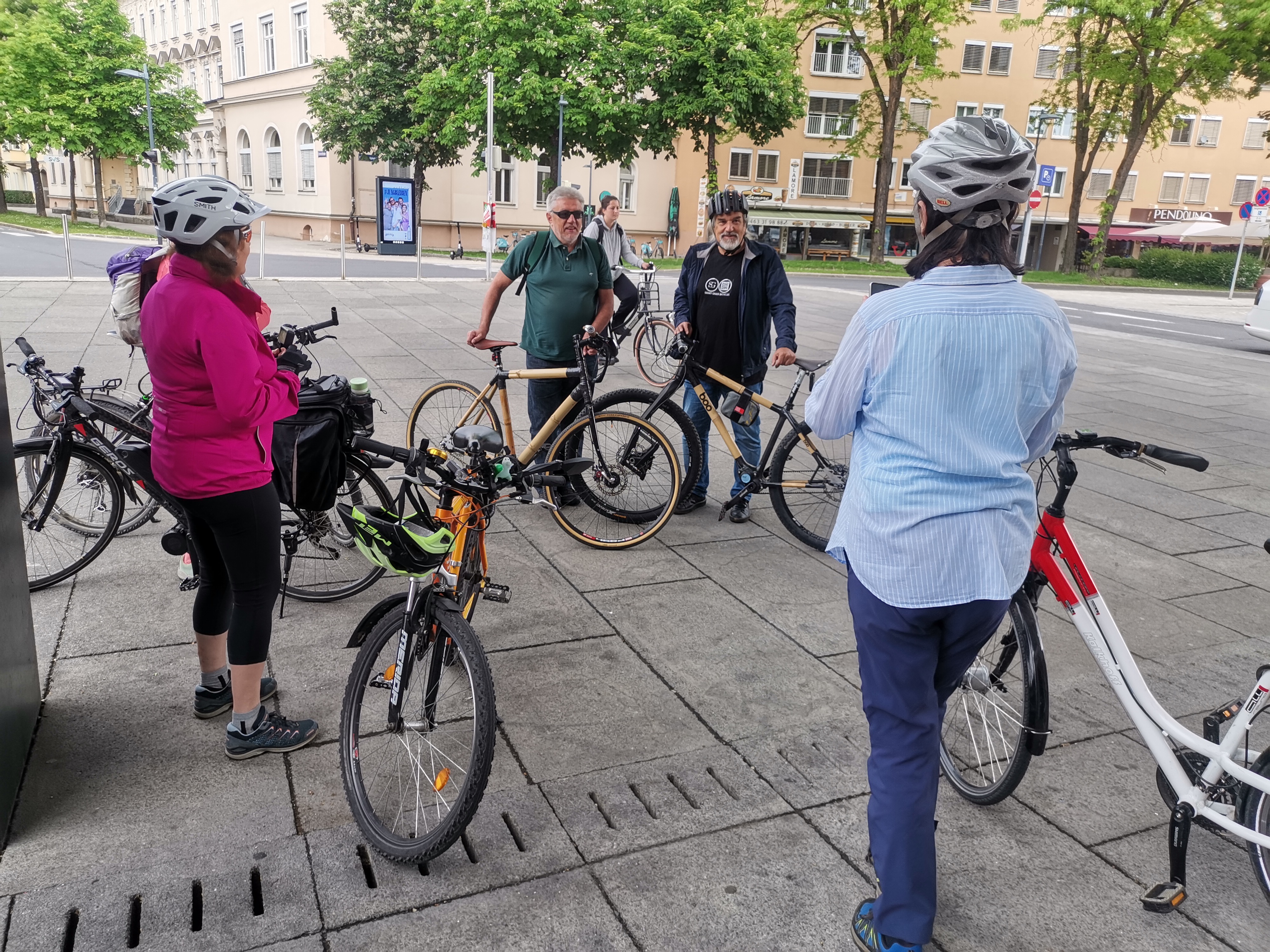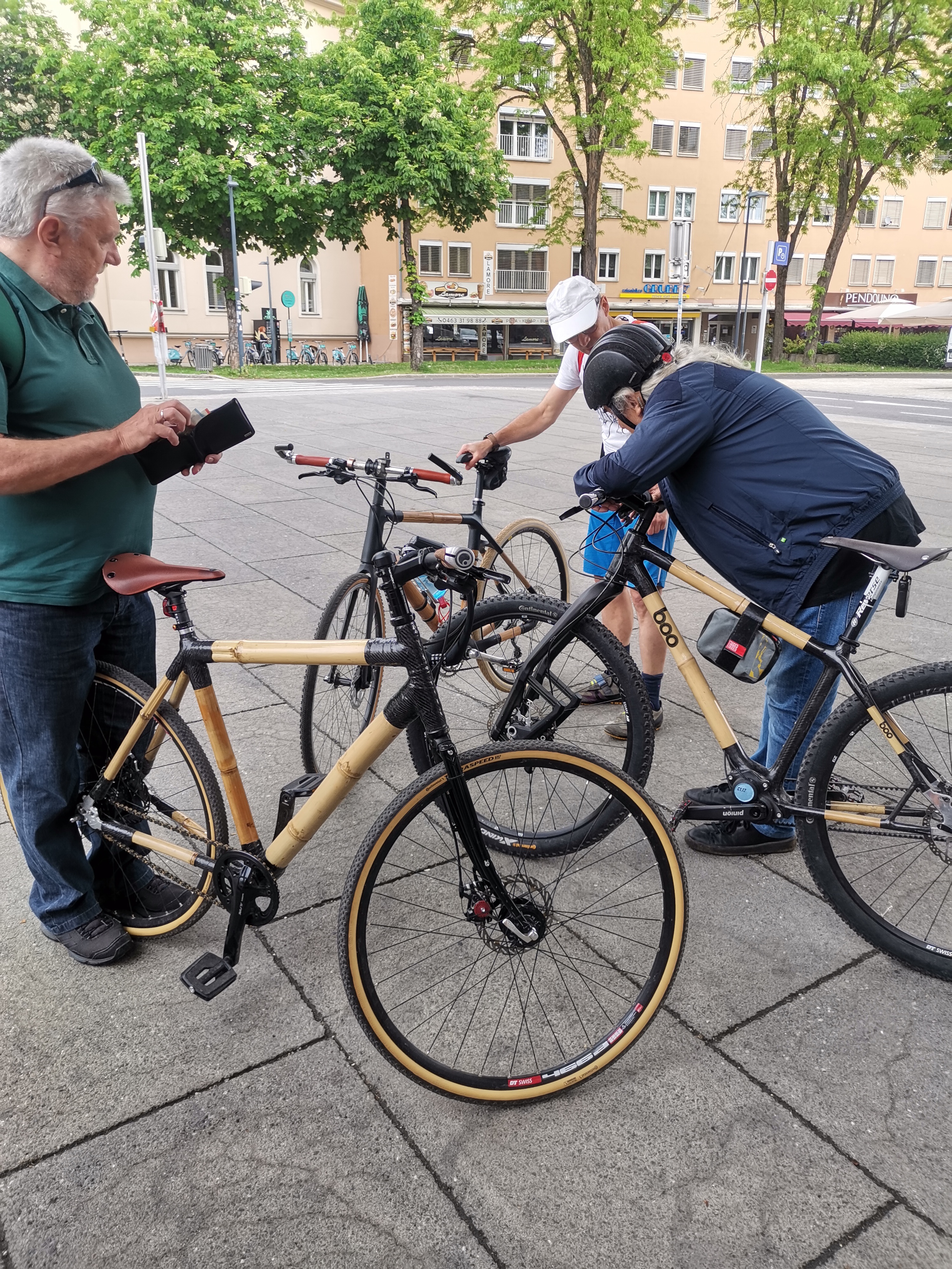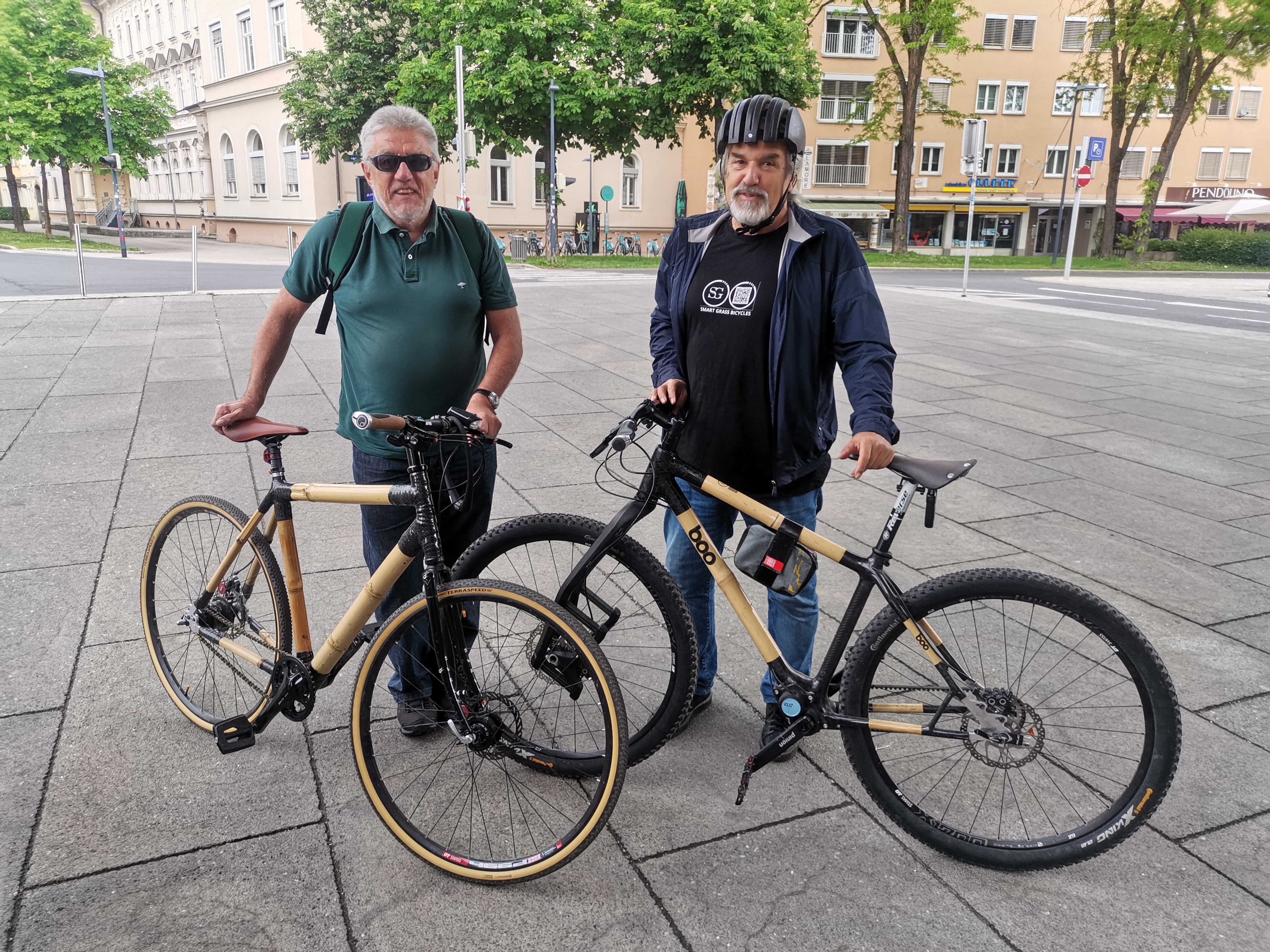 Bereits im letzten Jahr hat uns Oswald Wieser mit auf eine Zeitreise durch die Geschichte der Bambusfahrrad-Produktion in Kärnten genommen. Der leidenschaftliche Bambusfahrrad-Experte, der im Makerspace Carinthia regelmäßig Workshops zum Thema „Wie baue ich mein eigenes Bambusfahrrad?“ organisiert, hat sich eingehend mit den Herren Grundner & Lemisch beschäftigt, die schon vor 150 Jahren in Ferlach und Klagenfurt Fahrräder aus Bambus hergestellt und in alle Welt exportiert haben. Natürlich wurde ausgiebig gefachsimpelt. Wieder wurden wir bei der Tour von originalen Bambusfahrrädern begleitet.