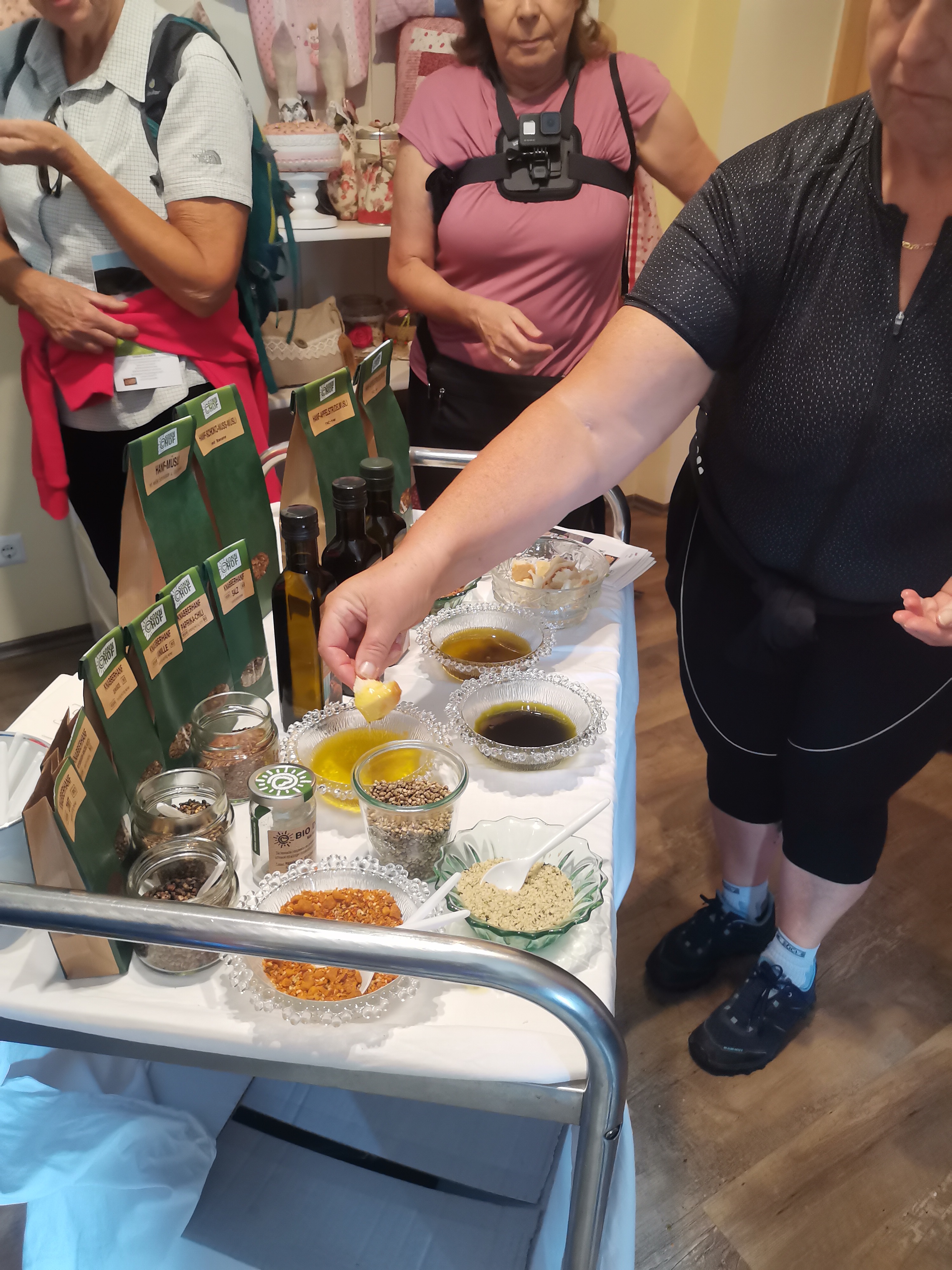 Von der hohen Qualität der Bio-Produkte, die mit viel Liebe und Sorgfalt am Sonnhof in St. Egyden hergestellt werden, konnten wir uns bei einer Verkostung selbst überzeugen. Ob Öle, Säfte, Gewürze, Pesto oder Mehle – sogar Seifen und Selbstgenähtes findet man im hübschen Hofladen.