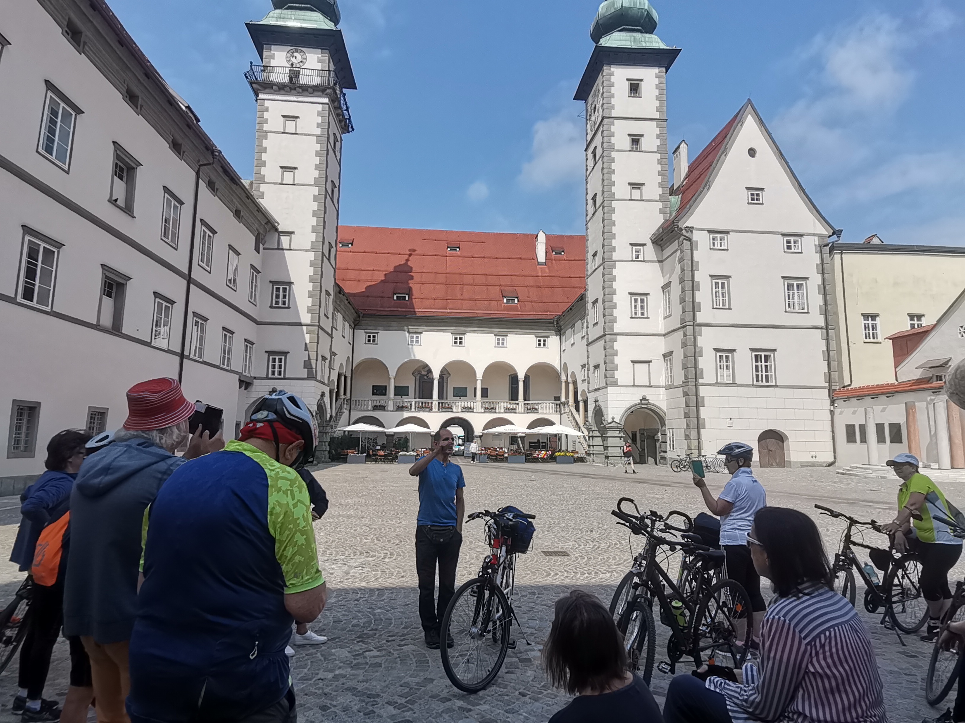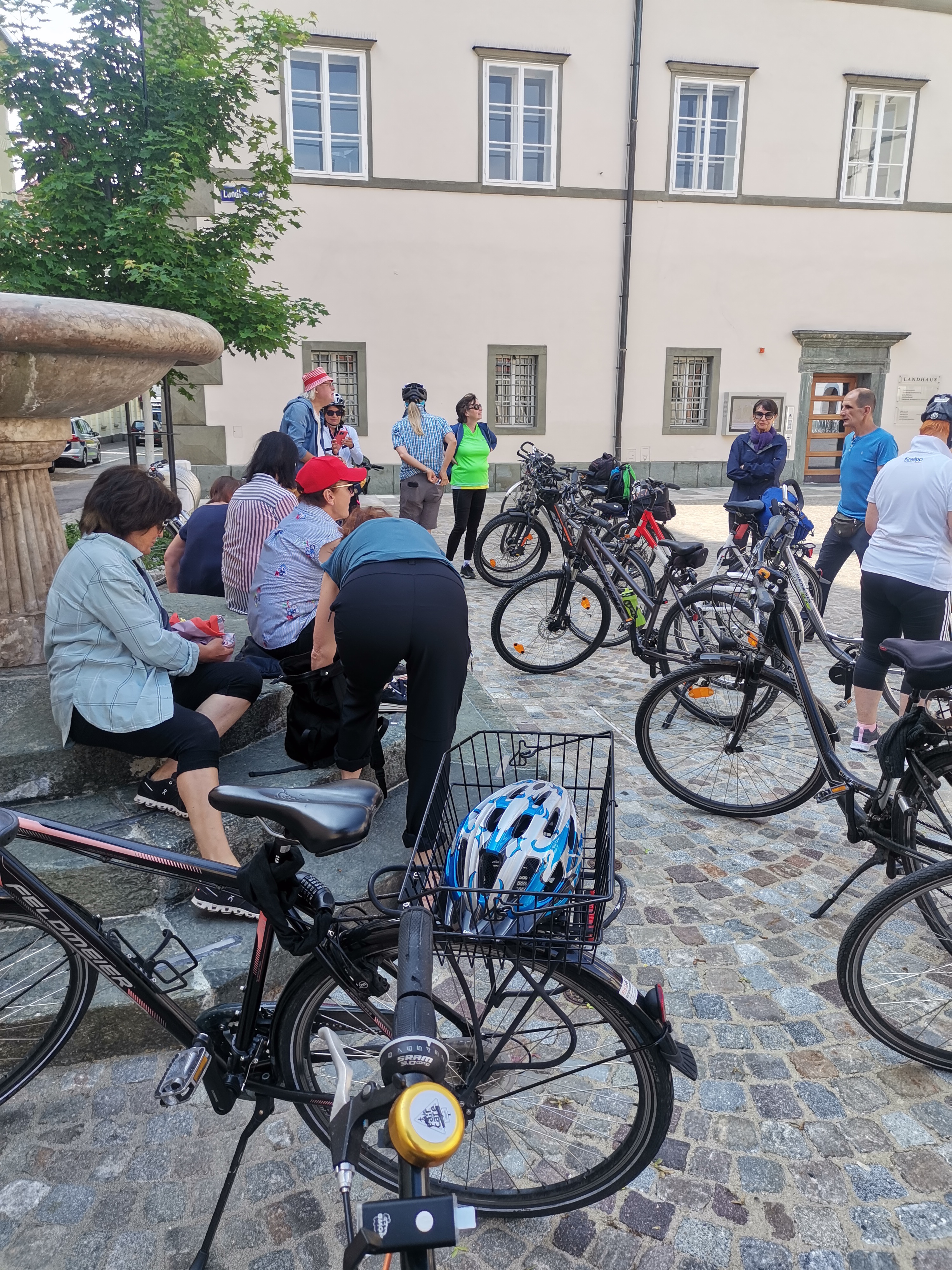 Nach der Begrüßung und einleitender Worte am Neuen Platz in Klagenfurt, war es nicht weit bis zu unserer 1. Station beim Landhaus. Pünktlich um 10 Uhr wurden dort die Glocken geläutet.