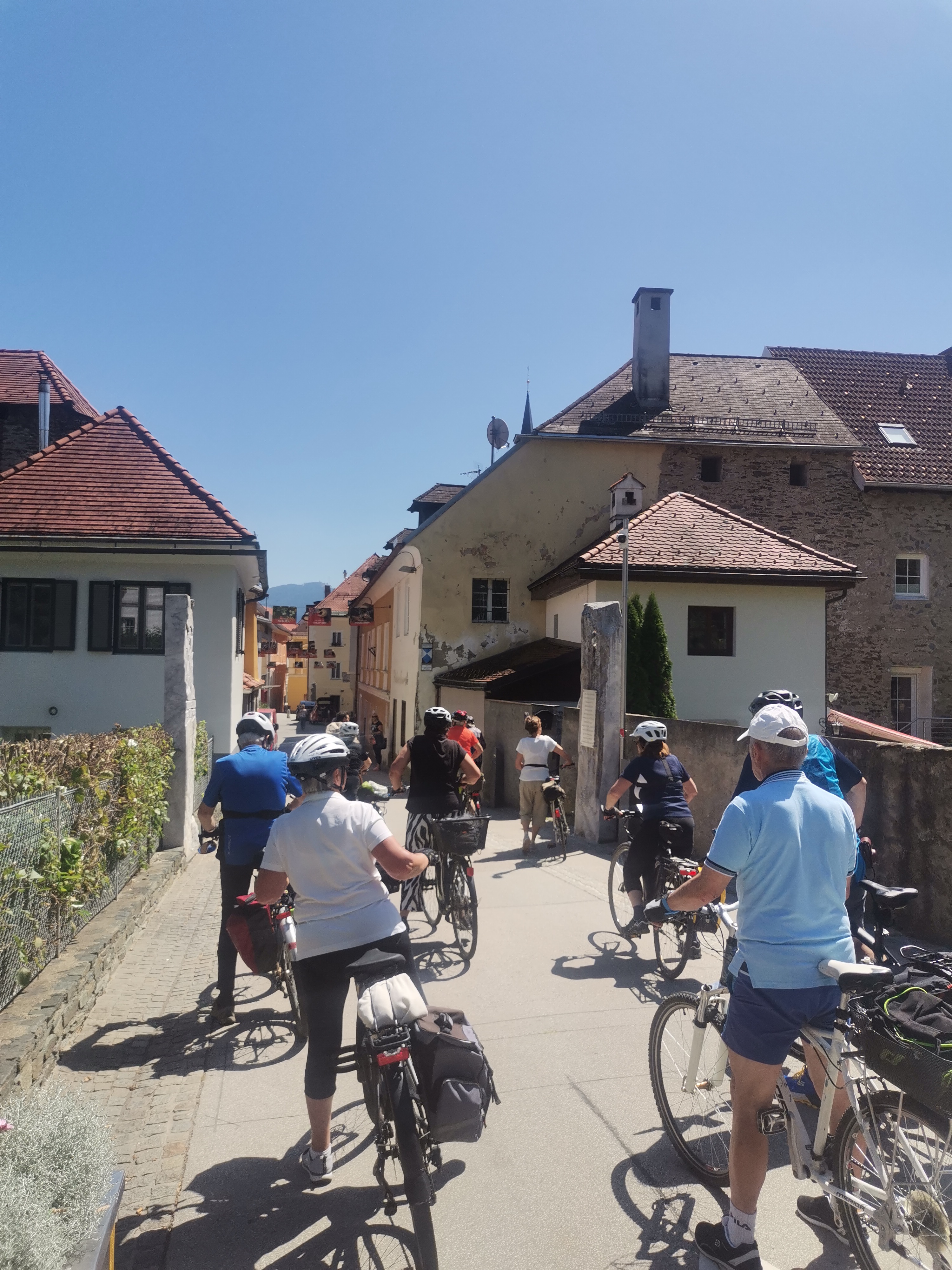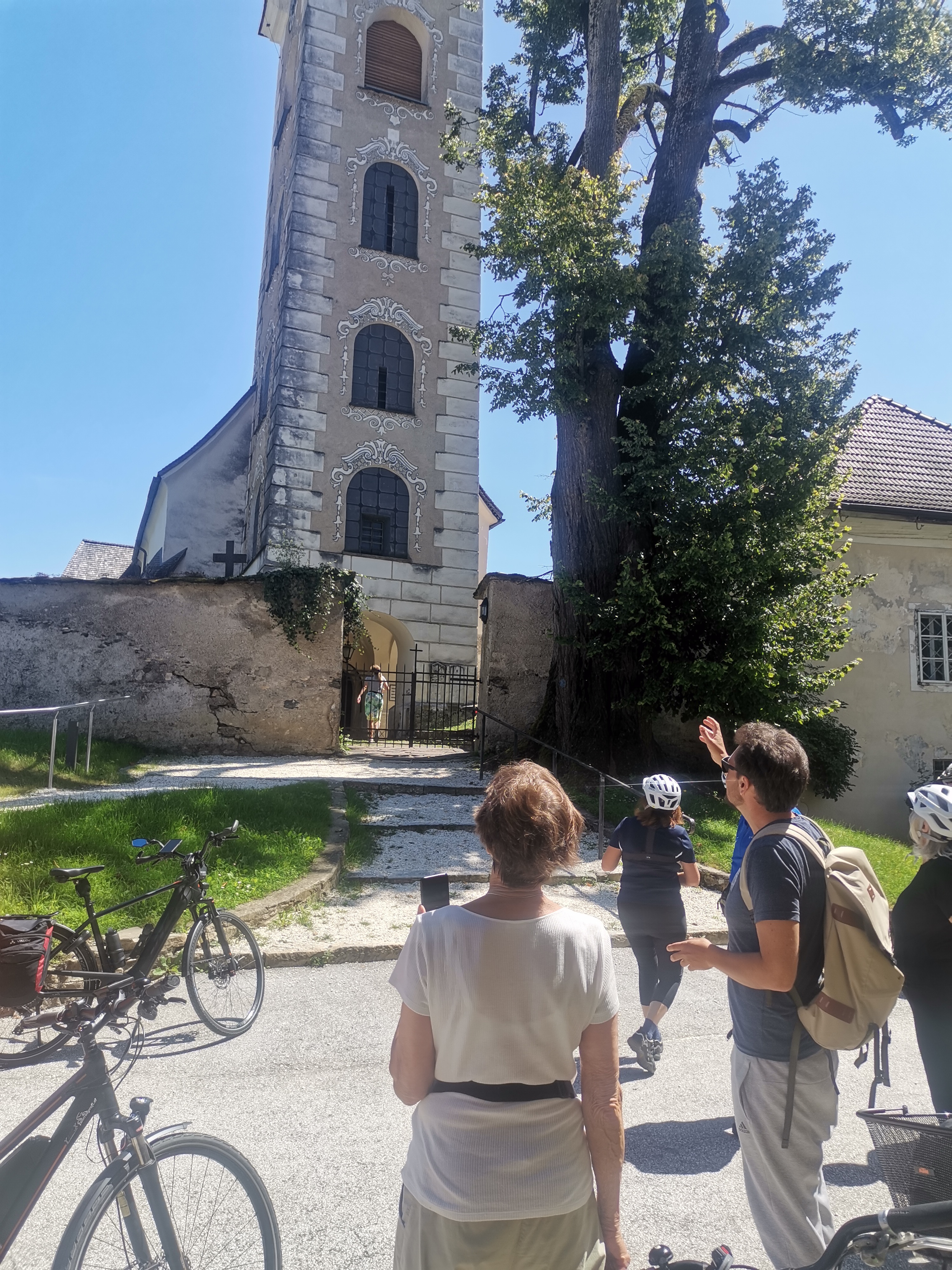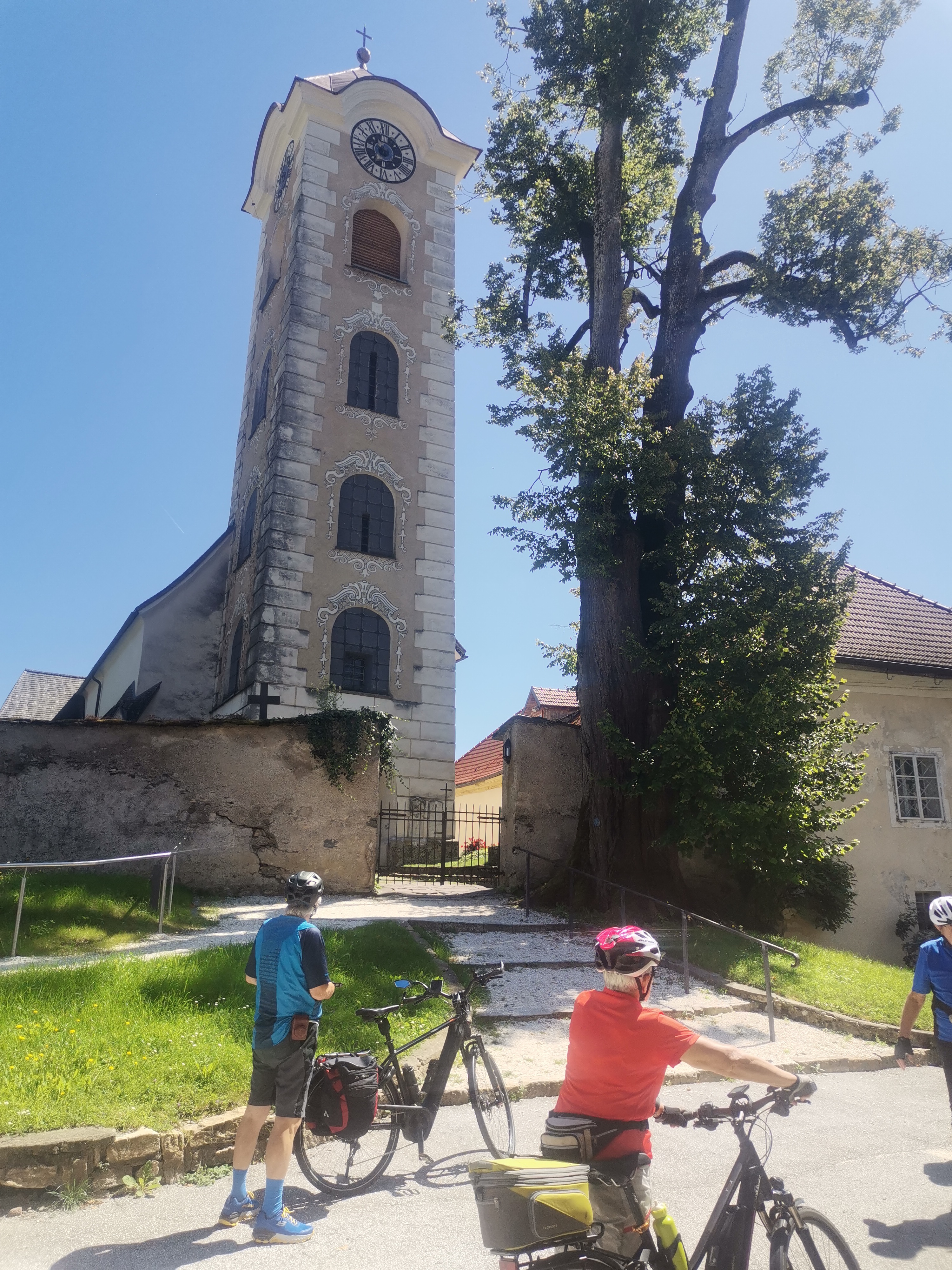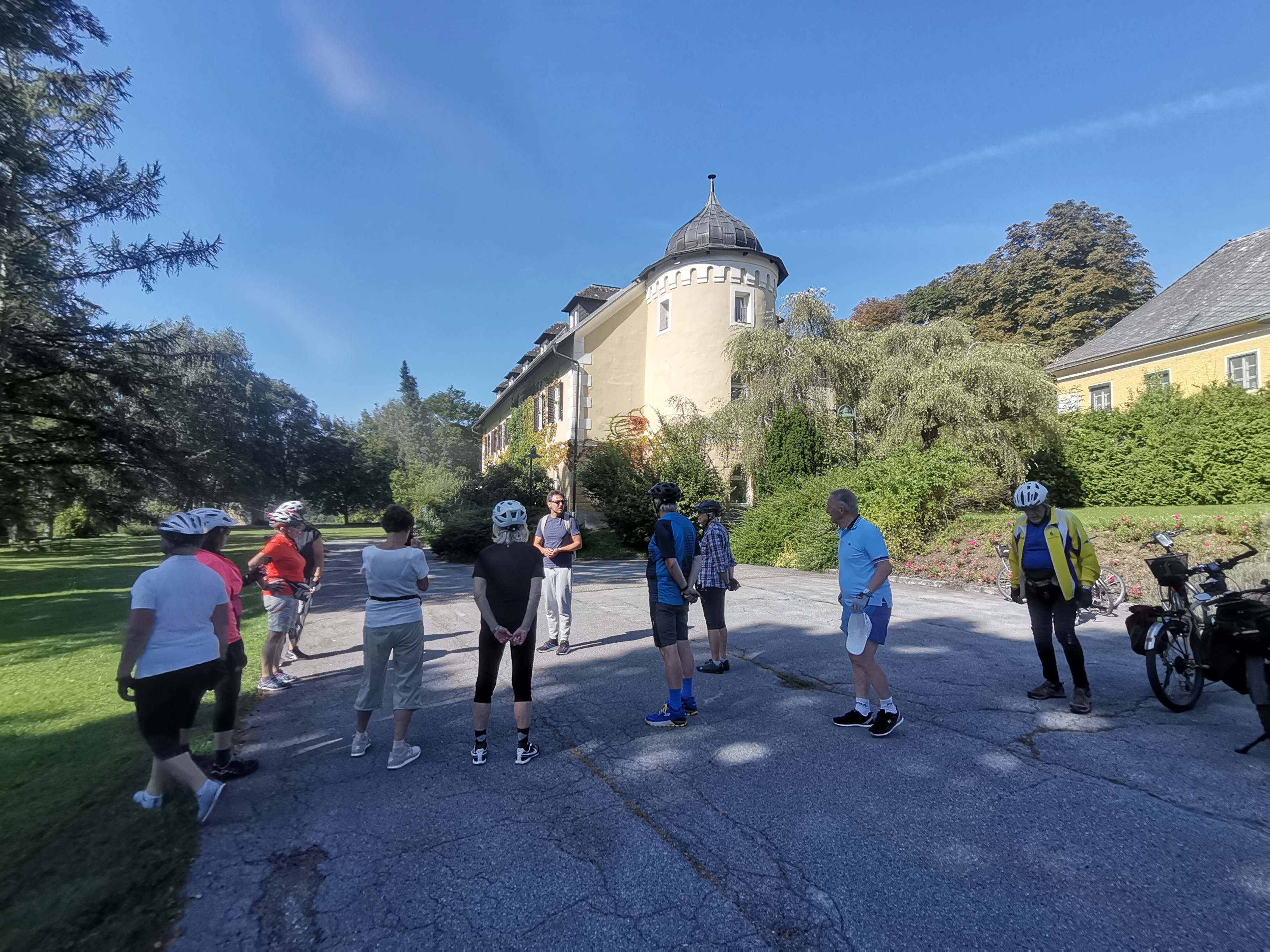 Nicht umsonst wird St. Veit als „Herzogsstadt“ bezeichnet. Überall in und um St. Veit stößt man auf Reste aus jener Zeit, als St. Veit das Zentrum der Kärntner Herzöge bildete. Vor allem die Familie Spanheimer, die zwischen 1122 und 1279 insgesamt neun Herzöge stellte und Städte wie St. Veit, Klagenfurt und Völkermarkt gründete, hat deutlich ihre Spuren hinterlassen. Unser Referent, der gebürtige St. Veiter Michael Jaritz, ließ die Geschichte der Herzöge und ihrer Gefolgsleute, den Rittern, Truchsessen und Marschällen bei Orten wie Schloss Hunnenbrunn, den Kraiger Schlössern und Schloss Frauenstein für uns wieder aufleben. Auch die Zwischenstationen, wie die einzigartige Kirchenanlage der Johanniskirche in Kraig und die Pfarrkirche Obermühlbach, wurden bereits während der Zeit der Spanheimer erstmals urkundlich erwähnt. Leider hatten wir aufgrund der vorangegangenen Unwetter keine Möglichkeit, wie eigentlich geplant, Burg Taggenbrunn zu besuchen. Noch ein Grund mehr, im nächsten Jahr einen zweiten Teil unserer Radreise durch das Zentrum der Herzöge von Spanheim zu starten.