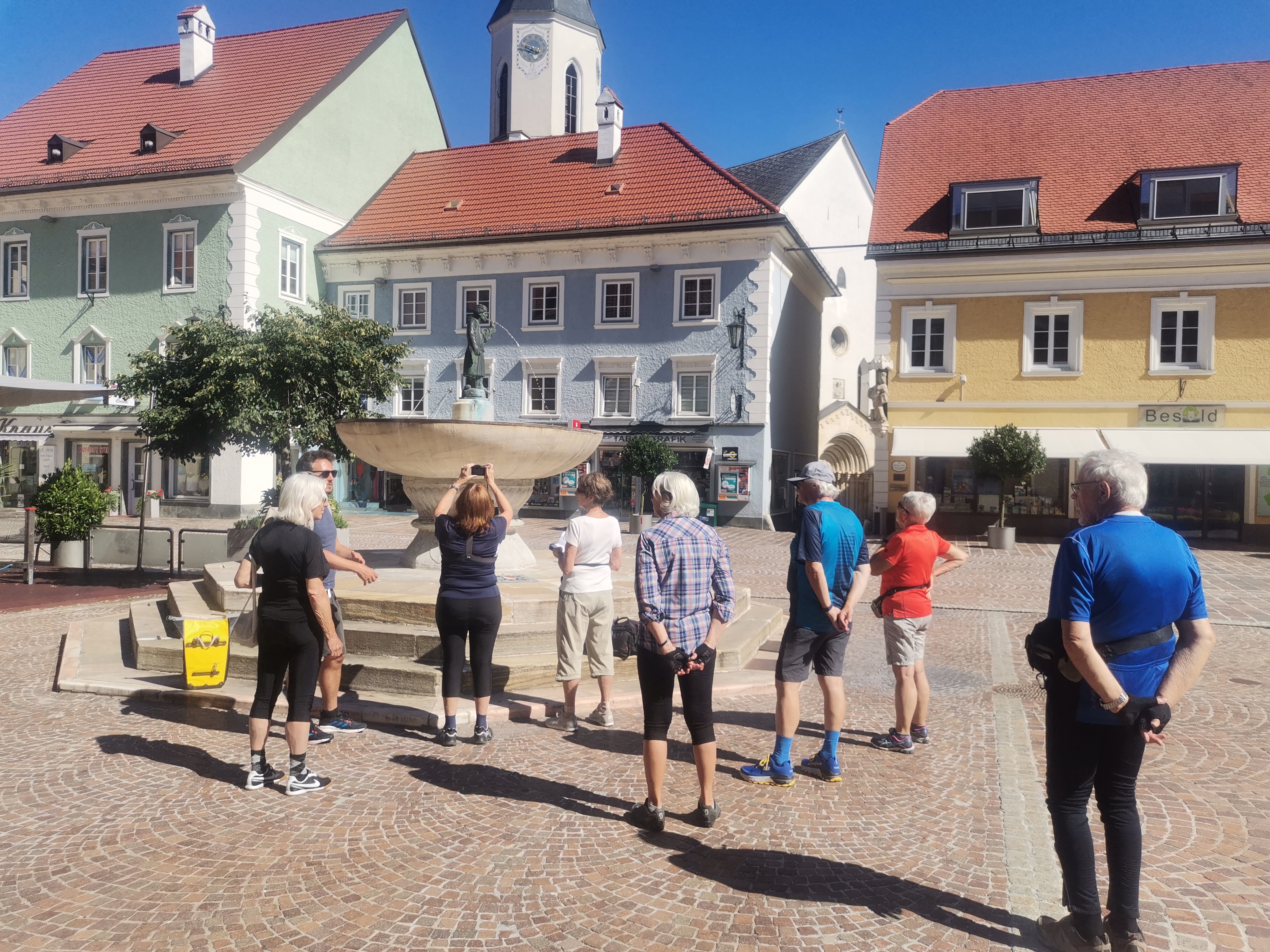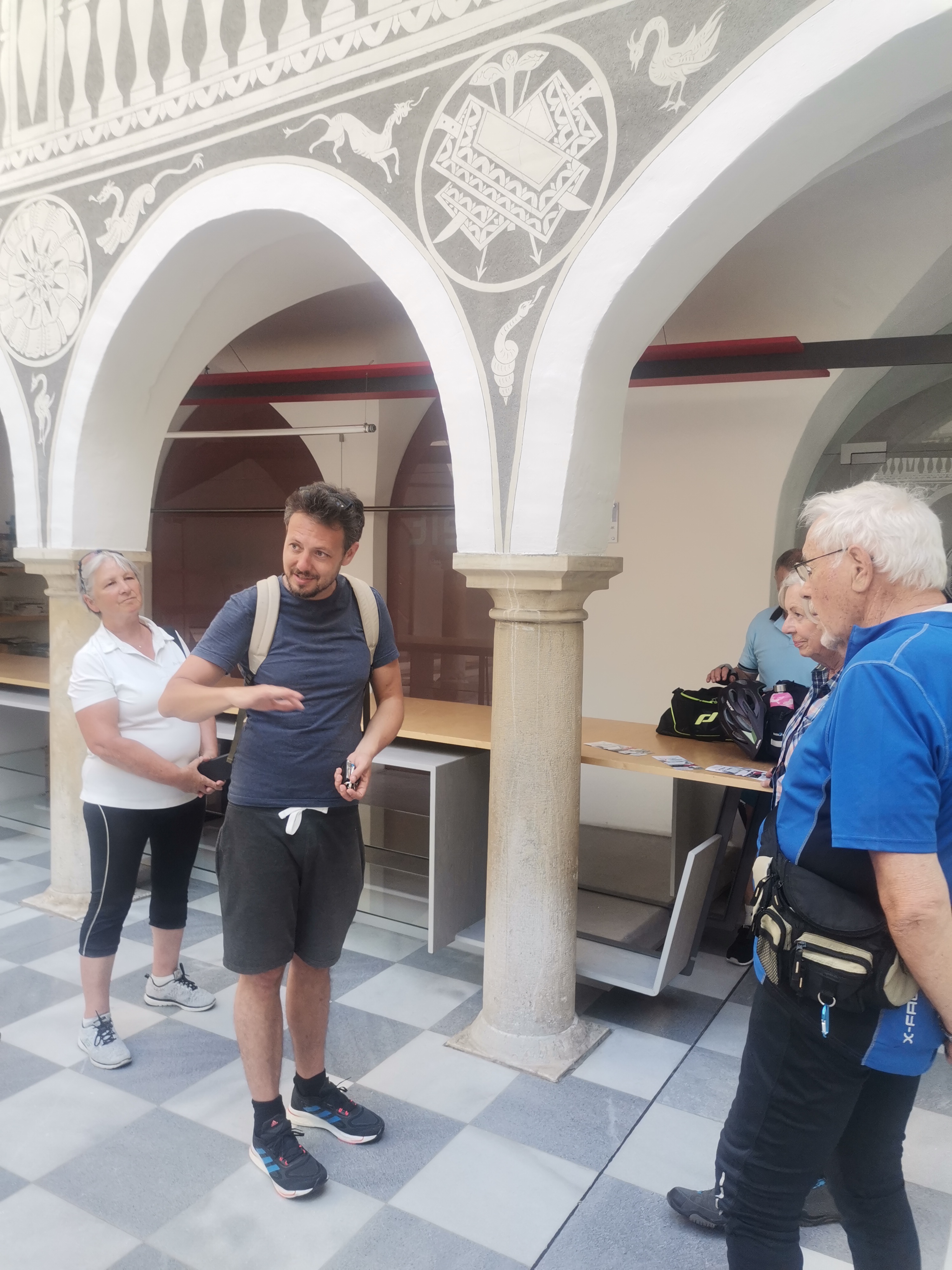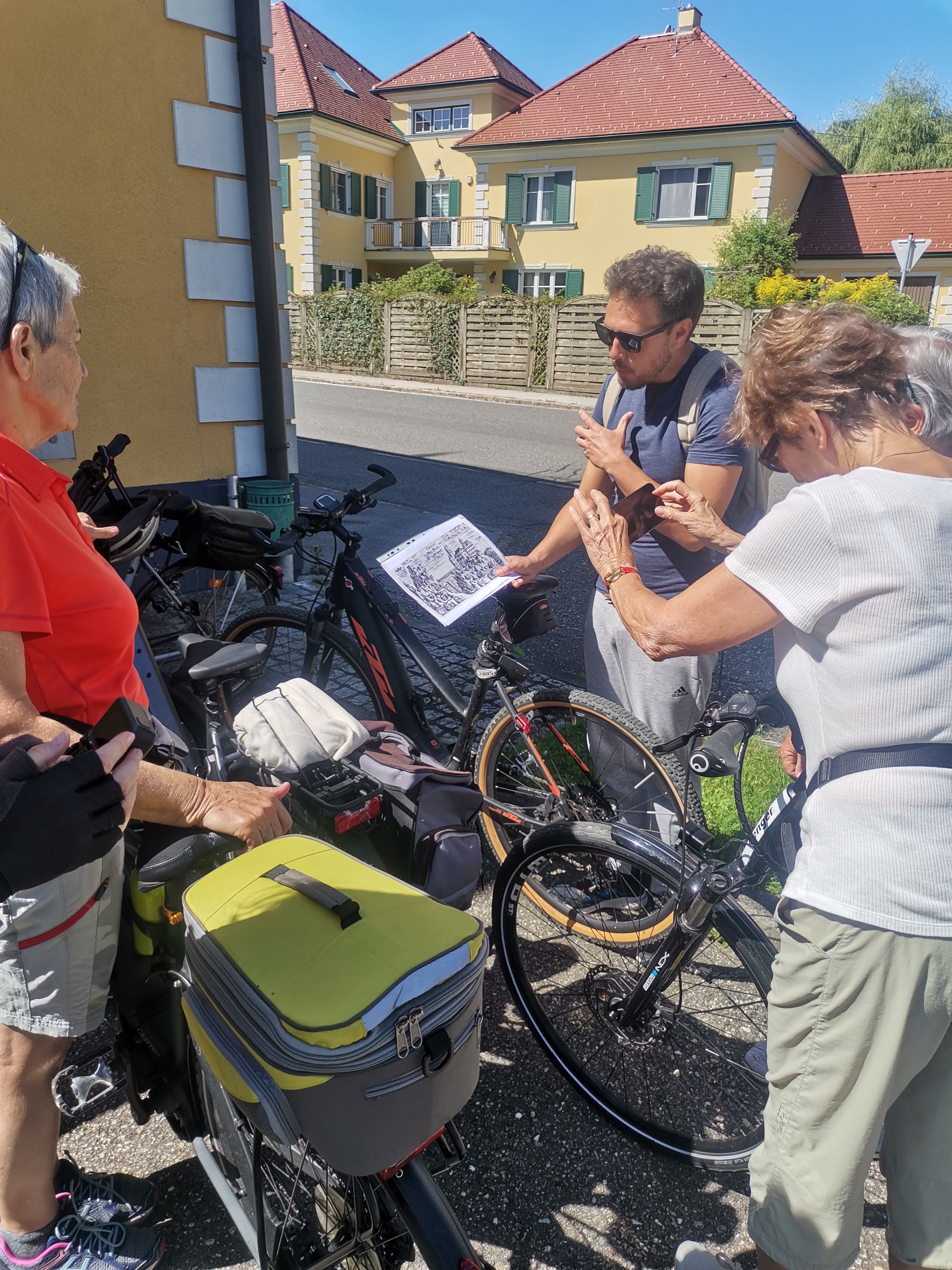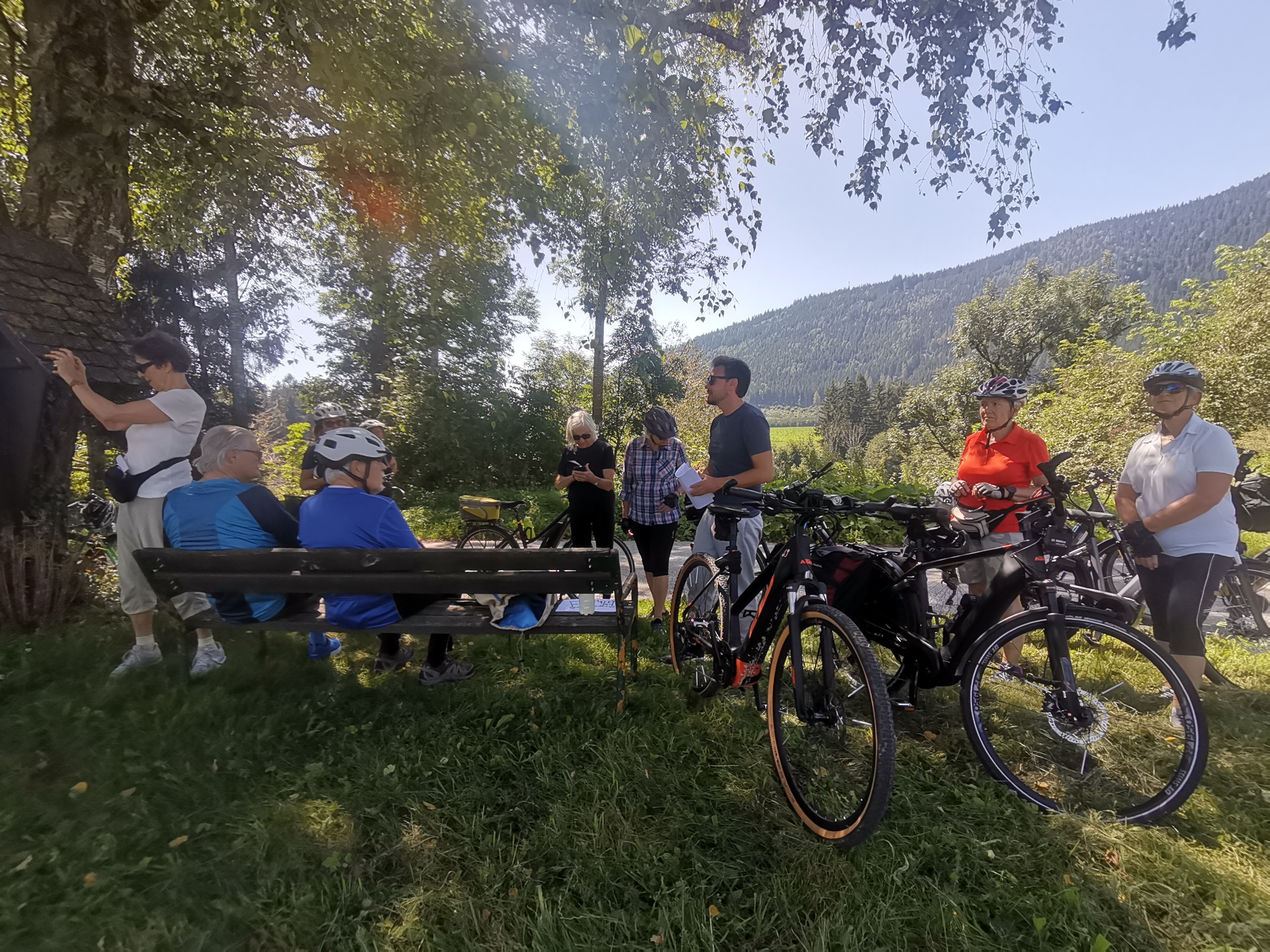 Nicht umsonst wird St. Veit als „Herzogsstadt“ bezeichnet. Überall in und um St. Veit stößt man auf Reste aus jener Zeit, als St. Veit das Zentrum der Kärntner Herzöge bildete. Vor allem die Familie Spanheimer, die zwischen 1122 und 1279 insgesamt neun Herzöge stellte und Städte wie St. Veit, Klagenfurt und Völkermarkt gründete, hat deutlich ihre Spuren hinterlassen. Unser Referent, der gebürtige St. Veiter Michael Jaritz, ließ die Geschichte der Herzöge und ihrer Gefolgsleute, den Rittern, Truchsessen und Marschällen bei Orten wie Schloss Hunnenbrunn, den Kraiger Schlössern und Schloss Frauenstein für uns wieder aufleben. Auch die Zwischenstationen, wie die einzigartige Kirchenanlage der Johanniskirche in Kraig und die Pfarrkirche Obermühlbach, wurden bereits während der Zeit der Spanheimer erstmals urkundlich erwähnt. Leider hatten wir aufgrund der vorangegangenen Unwetter keine Möglichkeit, wie eigentlich geplant, Burg Taggenbrunn zu besuchen. Noch ein Grund mehr, im nächsten Jahr einen zweiten Teil unserer Radreise durch das Zentrum der Herzöge von Spanheim zu starten.